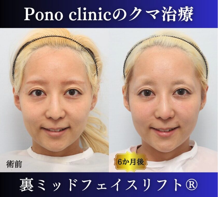 リスク/副作用:腫れ・内出血・左右差・違和感・イメージとの違いなどを生じる事があります。 費用:裏ミッドフェイスリフト®750,000円、サポーター糸110,000円、PRPF®療法 額280,000円・こめかみ260,000円、麻酔代50,000円(施術当時) -